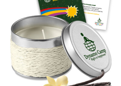 La candela “Right to Happiness” è realizzata in cera profumata alla vaniglia, contenuta in una elegante custodia in latta e confezionata con cura all’interno di un sacchetto in organza. Il prodotto è completato da un cartoncino che racconta il valore della tua scelta: sostenere Dynamo Camp e la sua missione.